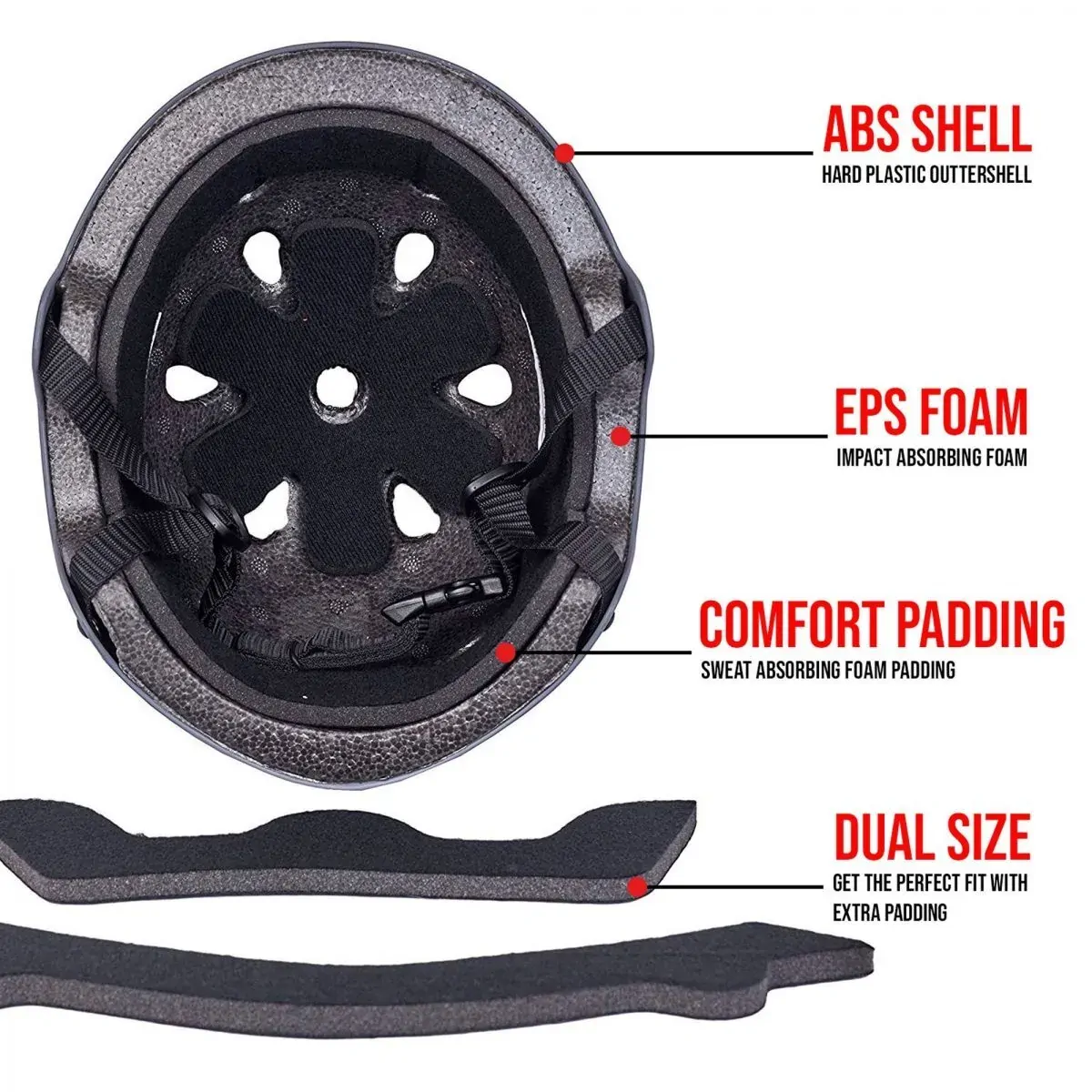 Furthermore CORE Action Sports Helmet Features Lightweight EPS polystyrene foam lining Premium low profile snug fit ABS outer shell 11 heat reducing air vents Inner padding 3 pieces removable & washable 3 point durable nylon strap Size adjustable chin straps with red safety buckle Classic low profile skate helmet design