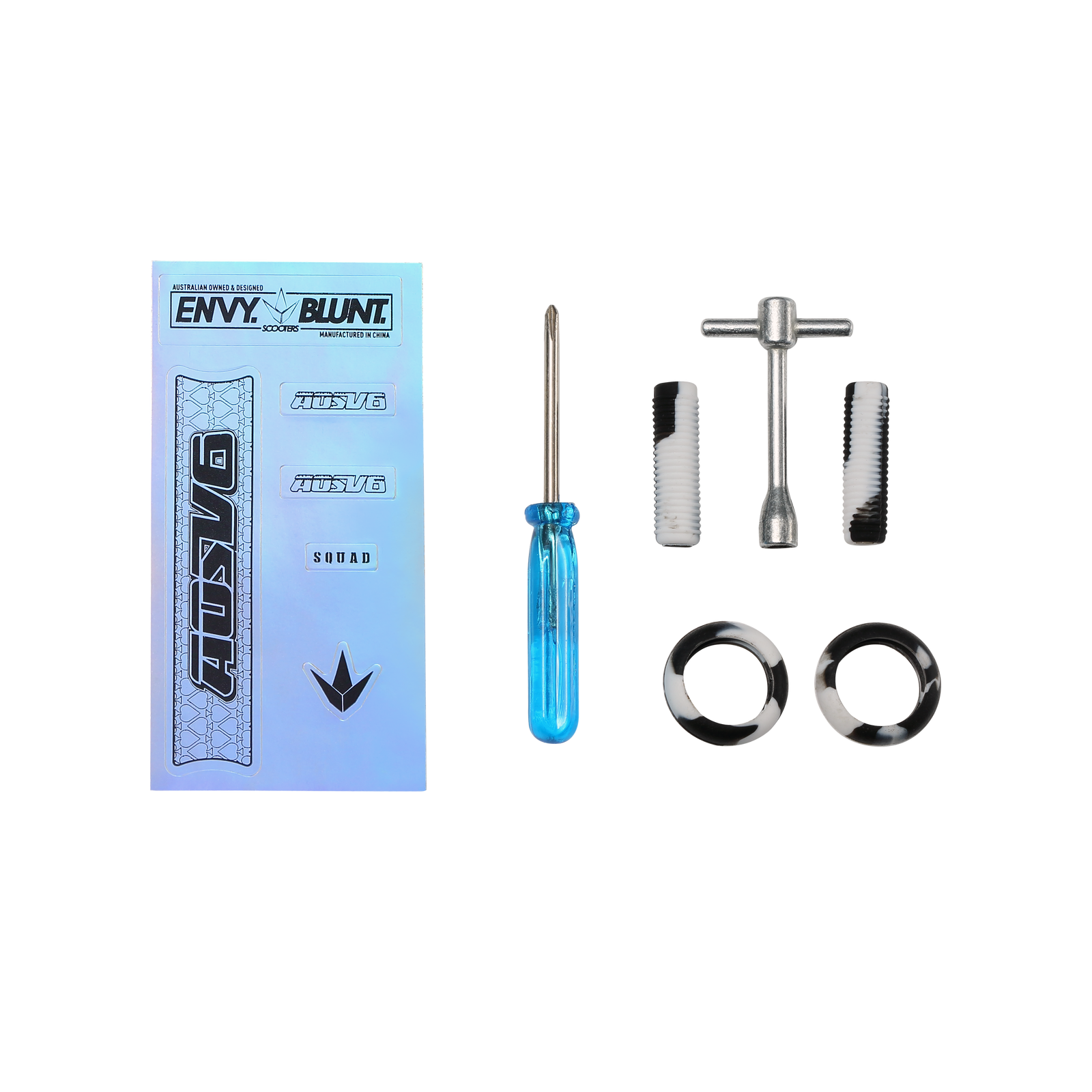 Includes decal sticker sheet, mini-screwdriver and mini-hex key, extra hand grips and extra wheel PU.